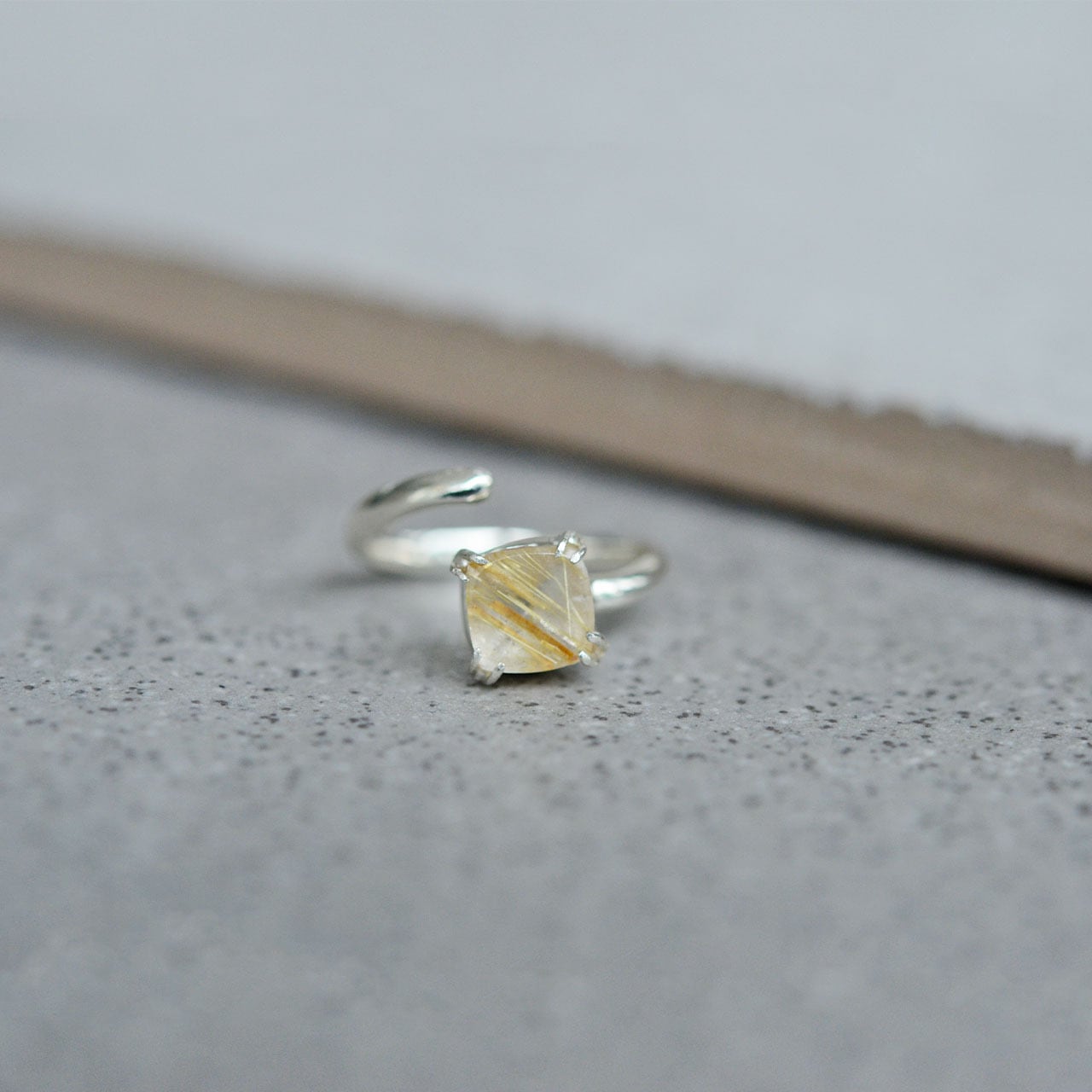 金色の光が差し込むように輝くルチルクォーツのリング。