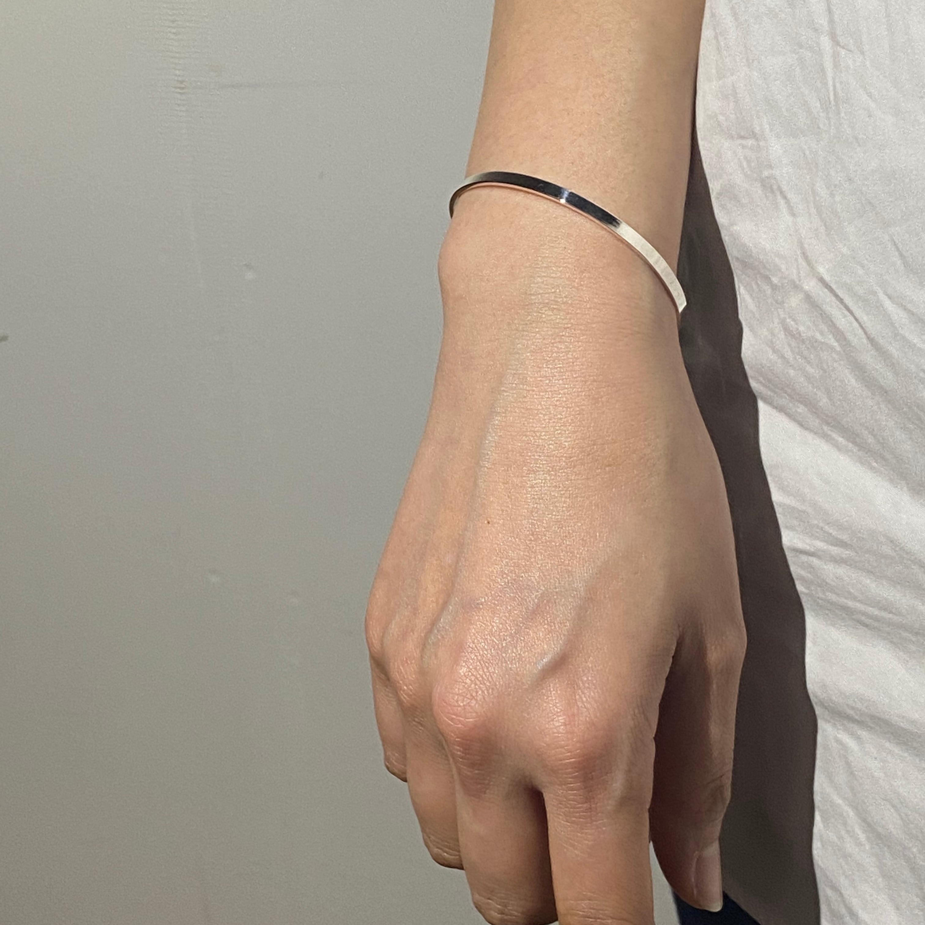 真っ直ぐな金属を、曲げ、形を整え、磨き上げてバングルが完成いたします。