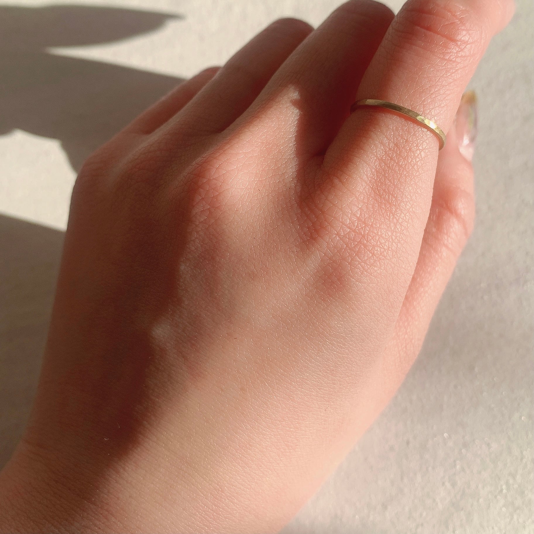 ・槌目:リングの表面を金槌で叩くことによって生まれる槌目模様。細やかな無数の面が光の反射でキラキラと輝き、手元を美しく演出します。