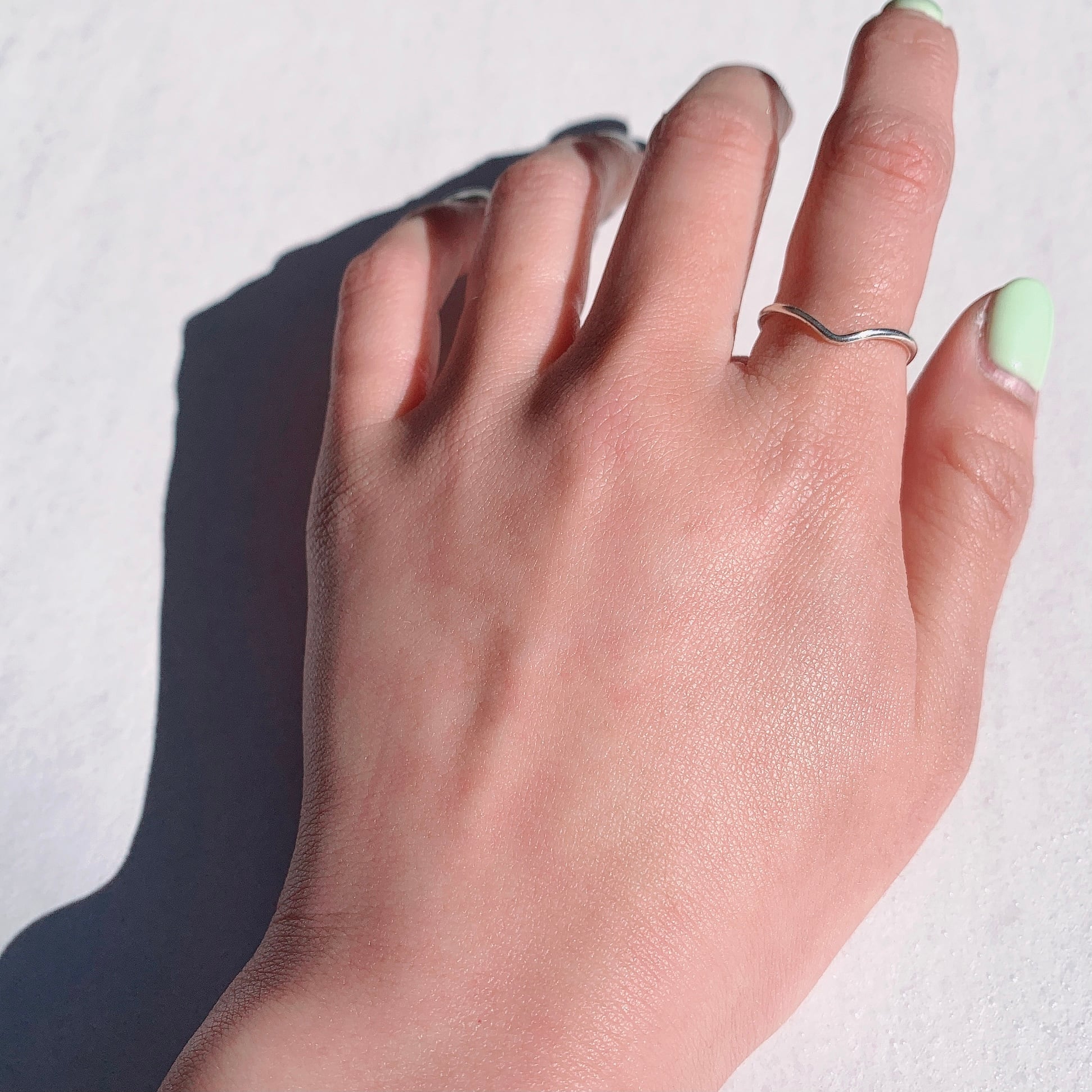 V字にカーブしたリングは、指をすっと美しく見せる効果があります。