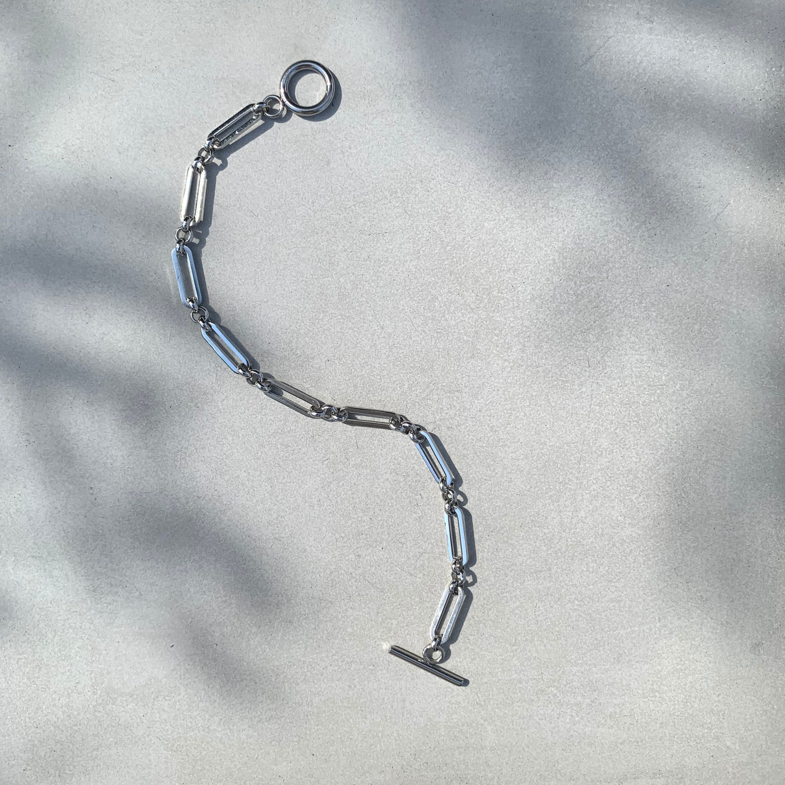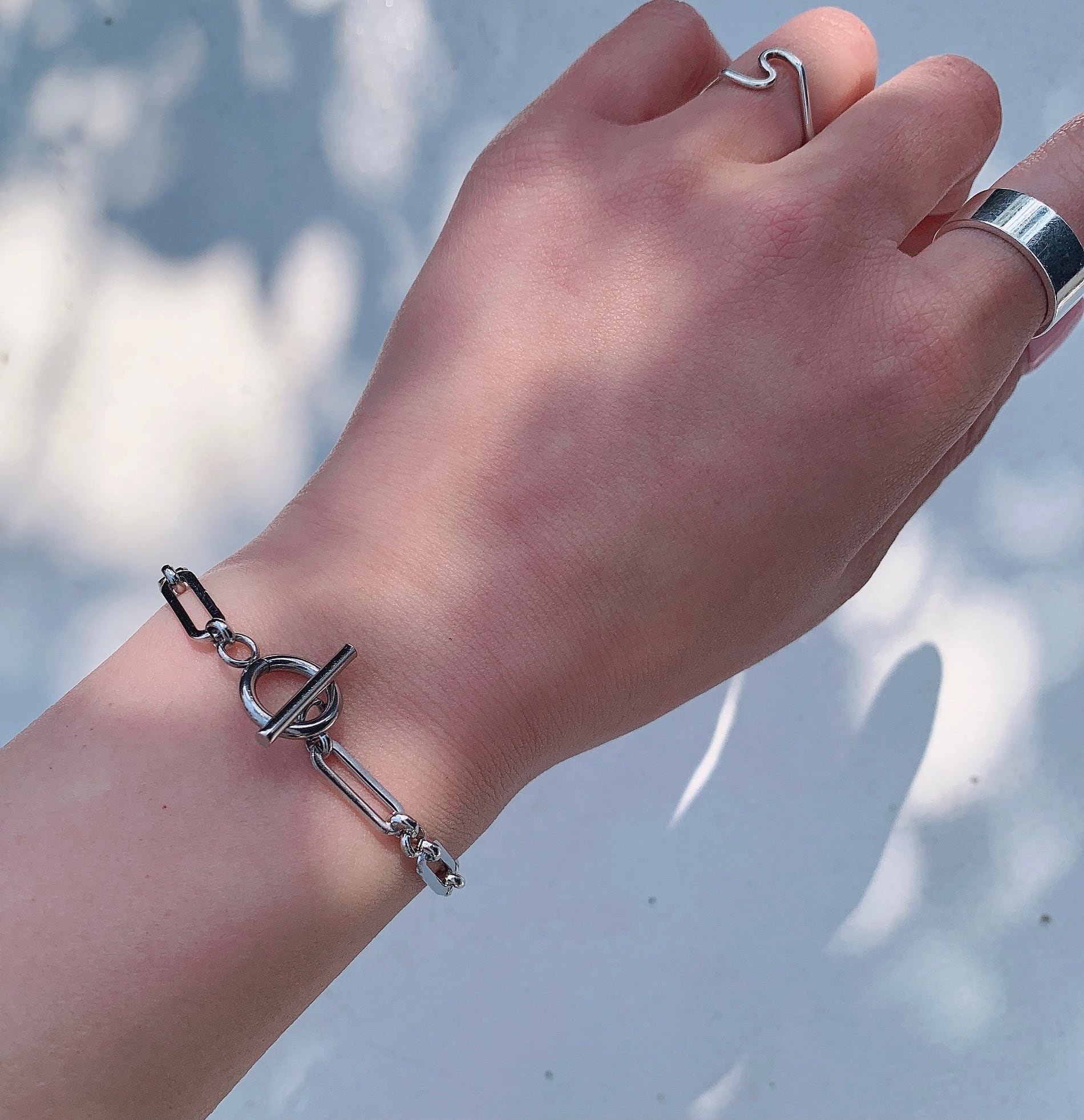 四角と丸の異なるデザインのチェーンが連なったブレスレット。