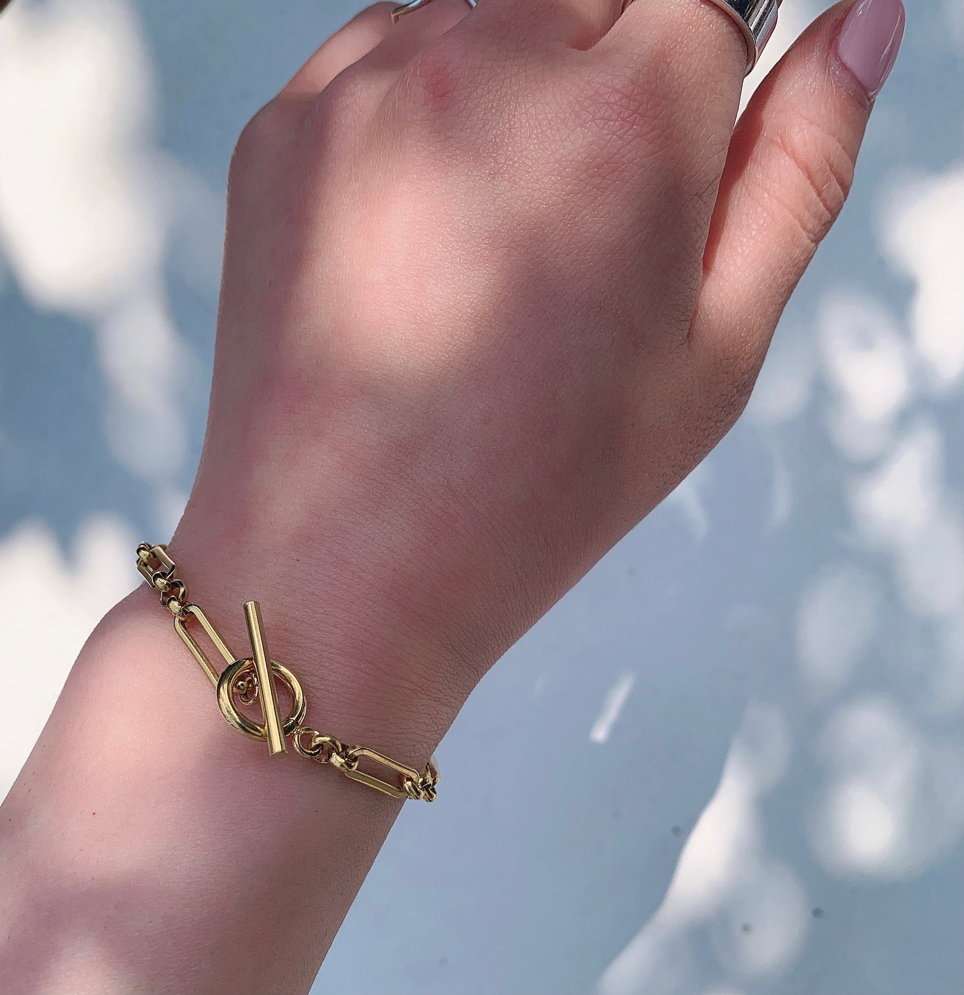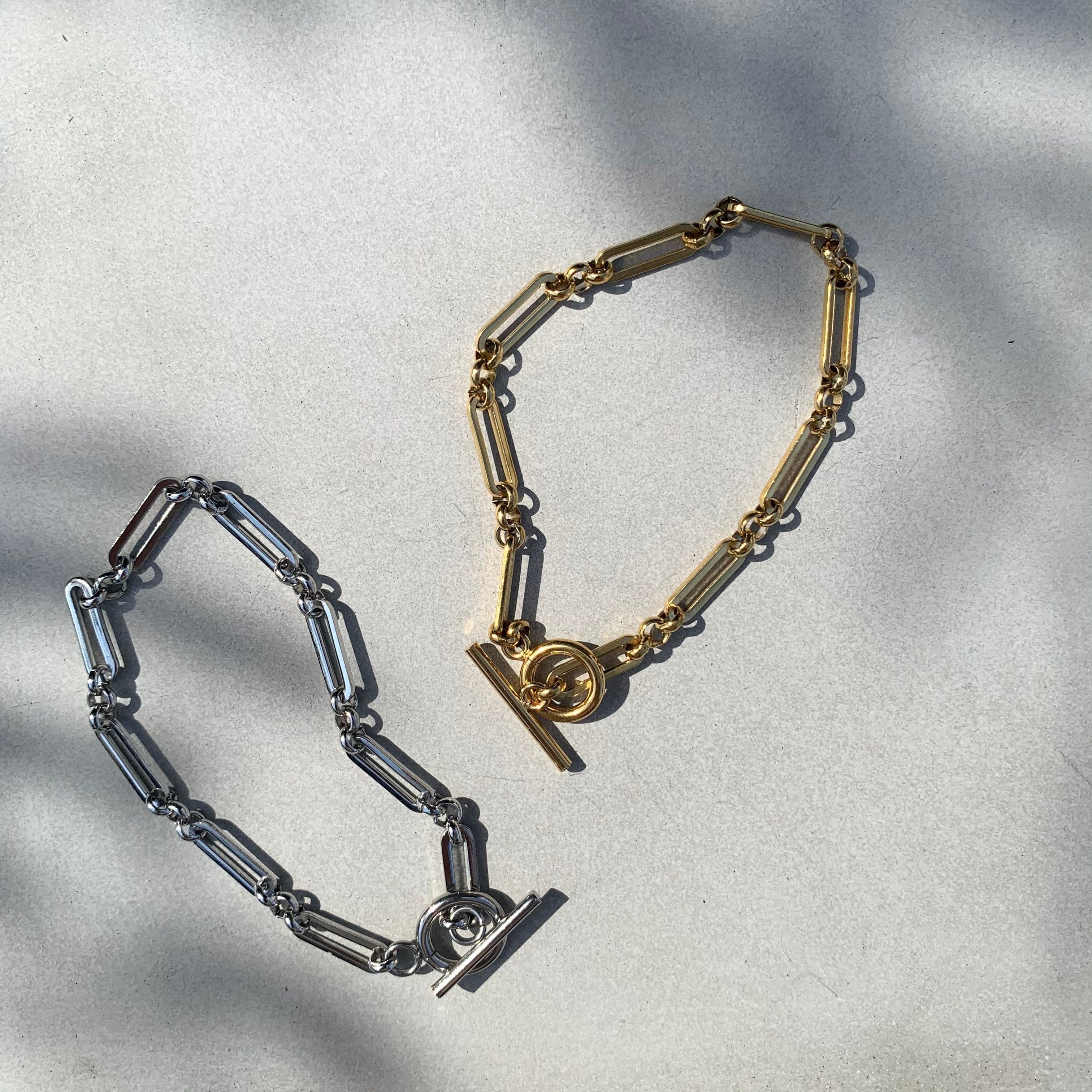 四角と丸の異なるデザインのチェーンが連なったブレスレット。